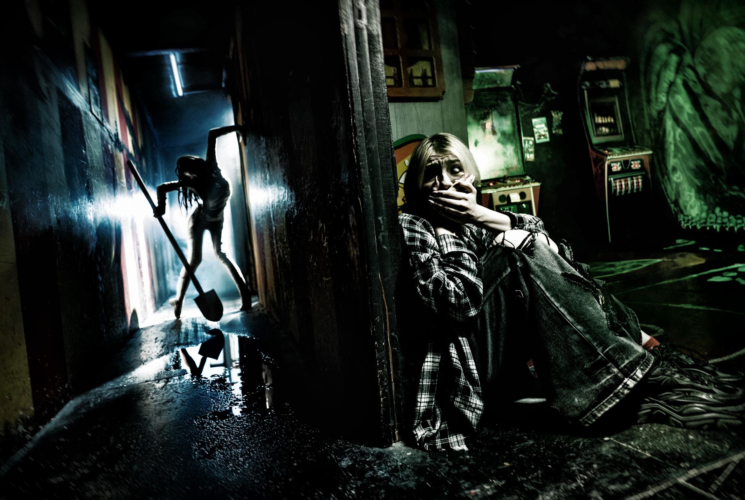 «Страшные истории для рассказов в темноте» – перформанс, основанный на одноименном фильме, который, в свою очередь, основан на книге Элвина Шварца. Тут вас ждет смесь жанров: мистика, стелс, контакт и экшн. Все они, кажется, не особо совместимы, но здесь очень хорошо дополняют друг друга. Для начала мистические персонажи, спустившиеся с экрана, пугают своими передвижениями, неожиданными появлениями, а затем контактные герои, словно из преисподней, гонят вас по коридорам кинотеатра, периодически поджидая из-за угла. Персонажей здесь довольно много, и все они различны по своему предназначению, гриму и костюмам. Пугающий образ каждого соответствует определенному фильму. Были и плавные быстрые передвижения, и ломающиеся конечности, и новые и необычные для нас костюмы. Актеры постарались очень хорошо, за что им огромное спасибо, ведь актерская игра – залог положительных эмоций после квеста.