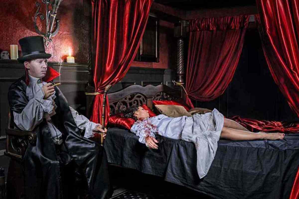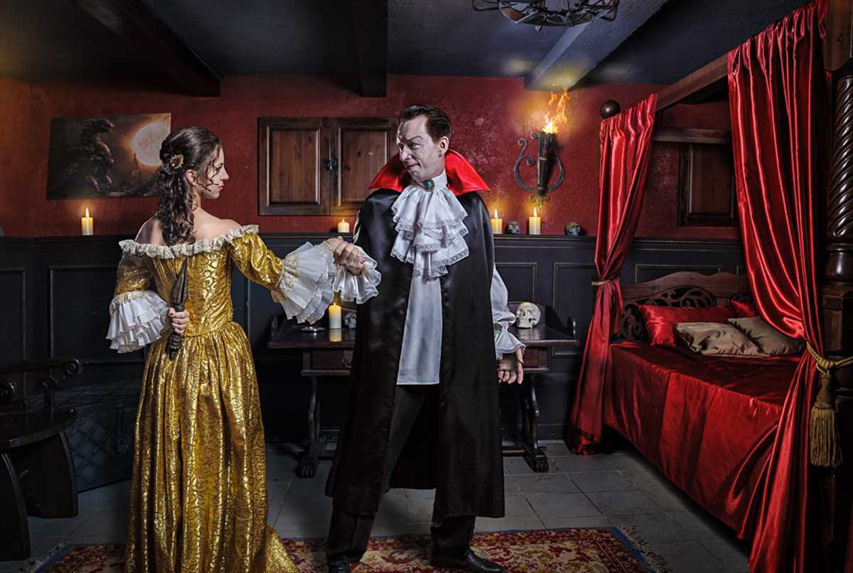 Разберем техническую часть чуть подробнее. Комнат здесь немного больше, чем это бывает на классическом эскейпе, и каждая представляет из себя какое-либо помещение замка графа Дракулы. Это могут быть его парадные покои с огромной кроватью или же темное подземелье, где стоят каменные статуи, алтарь и клетки. И, конечно, склеп, где мирно спит сам граф. Комнаты наполнены различными предметами, которые могут быть как игровыми, так и просто создавать ощущение жилого помещения. Это массивный камин, картины, старинная люстра, каменные статуи и прочие предметы мебели, которые созданы специально для квеста таким образом, дабы погрузить вас в XIX век. Вот взять, например, стул. Он не будет обычным. У него будет винтажная резная спинка. То же можно сказать про стол или шкаф. Соответственно, в более мрачных комнатах и оформление будет соответствующее – камни, скелеты, алтари, черепа, свечи. Вообще к декорациям подошли очень детально, поскольку не обошли вниманием не только стены, но и потолок. Ни один кусочек не выбивается из атмосферы того, что ты попал в старинный замок, где живет мистическое существо.