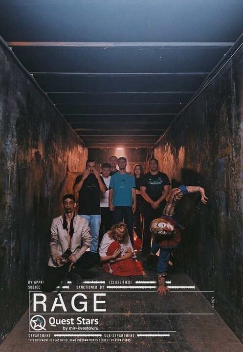 (любитель)Rage - это супер динамичная и захватывающая история. Точнее несколько. Каждая из которых будет держать вас в постоянном напряжении. На квесте очень качественная и красивая игра актёров. Их быстрые перевоплощения в абсолютно разных персонажей привела нашу компанию в восторг. Так же огромное спасибо администратору. Информирование перед квестом, завод и светошумовые эффекты - просто пушка!