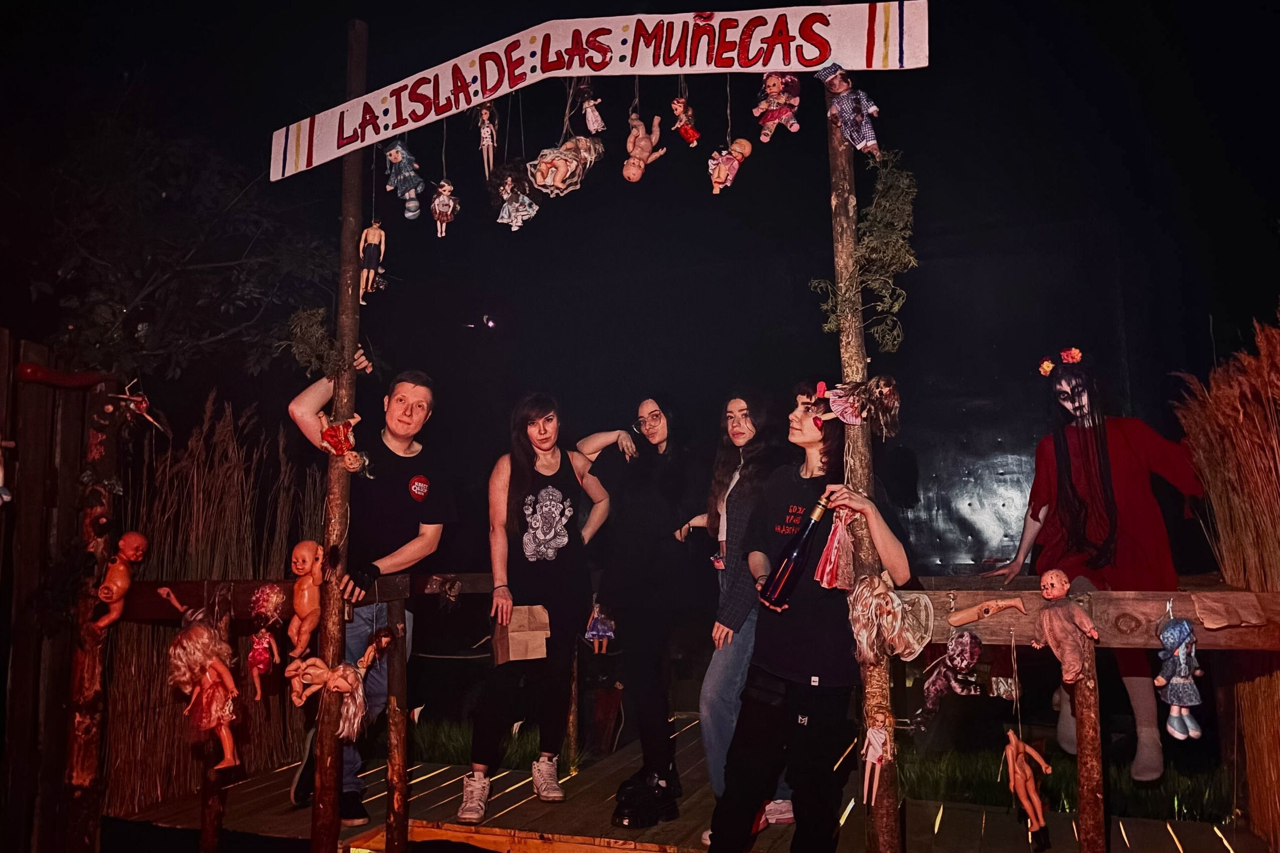 Помещение – настоящая Мексика! С первой минуты команда оказалась на острове. На нем располагалось несколько домов и внушительное пространство «под открытым небом». Остров под завязку наполнен куклами – на заборах, в домах, на земле, на алтарях, на веревках. Абсолютно разные куколки: маленькие, большие, пупсы, мягкие, изуродованные. Световая схема подсвечивала причал с лодками. Гроза здесь реально была похожа на грозу – и техника, и оформление работали на полную. Остров состоял из нескольких частей. В какой-то момент команда поднялась на помосты над водой, в другой – блуждала среди заборов, понимая, что те не защитят от зла своими редкими досками. Под ногами трава, повсюду растительность, камыши, цветы. Комнаты в хижине разного содержания: жилая с куклами, круглым столом и бытовыми предметами; мистические; с оккультными символами, алтарями, свечами и исконно мексиканской атрибутикой. На потолке парящие кресты, на улице – внушительное кладбище с эстетически красивыми надгробиями. Помещение многоуровневое, с экшн-переходами. Мексика чувствуется во всем: в образах персонажей, в декорациях, в обилии растительности и ярких рисунках. Помещение – не запертые дома, а именно стилизованный многоуровневый остров. Это было похоже на челлендж – пройти все помещения.